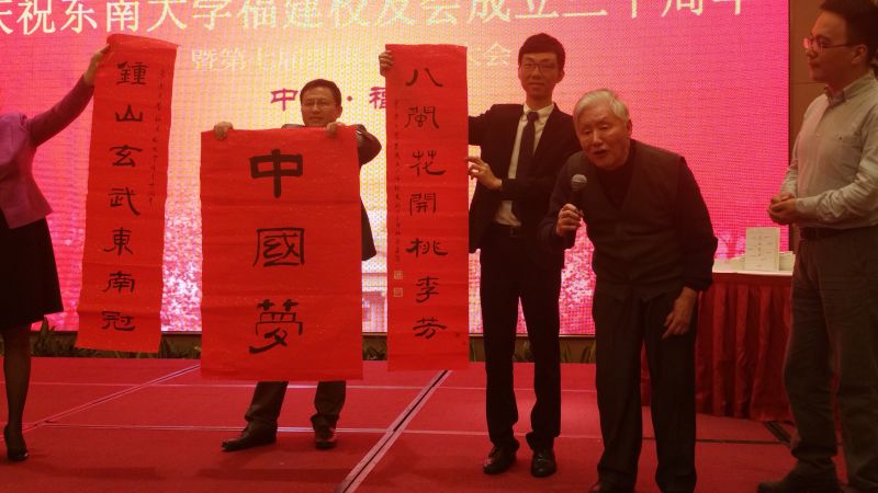 在本届东大福建校友会成立三十周年庆祝大会期间,注册送彩金最新 56级校友林亮森先生为福建校友会赠送了内容为“钟山玄武东南冠,八闽花开桃李芳”对联一副。