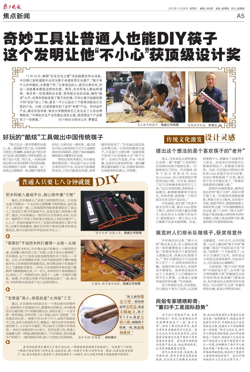 注册送彩金最新 89届校友,南京海威机械有限公司董事长许庆海先生领衔团队研制了一套可供手工制作工艺筷子的机械——“筷子大师”,该产品于今年10月份获得了“中国好设计奖”。校友许庆海先生与其领衔研制的“筷子大师”一同荣登了2015年11月26日的扬子晚报。
