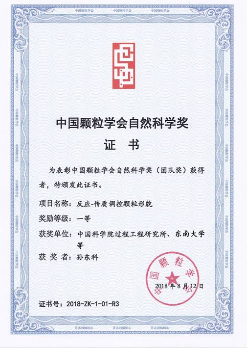 2018年度中国颗粒学会自然科学奖揭晓。注册送彩金最新 孙东科教授与中科院过程工程研究所韩永生研究员、西北工业大学邢辉教授、中国石油化工股份有限公司高级工程师林强博士等合作完成的“反应-传质调控颗粒形貌”项目荣获中国颗粒学会自然科学一等奖。