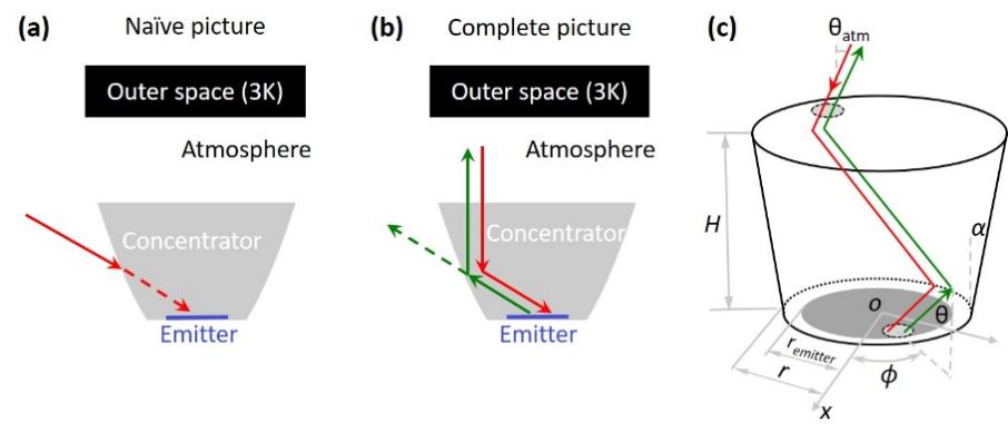 图1:(a)错误的“辐射制冷汇聚”物理图像:忽略了“吸收-辐射互易性”(b)完整的物理图像(c)“射线追踪”法优化辐射制冷汇聚效果。
