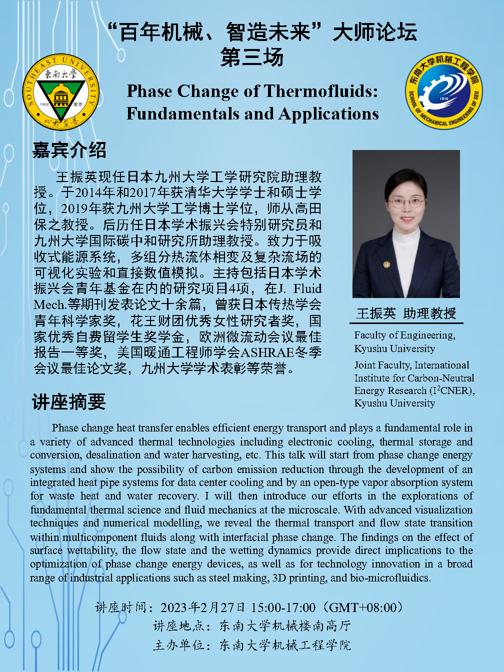 “百年机械、智造未来”大师论坛第三场:王振英助理教授——Phase Change of Thermofluids: Fundamentals and Applications