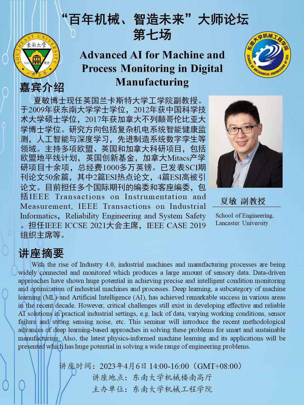 夏敏博士现任英国兰卡斯特大学工彩金社区 副教授。于2009年获东南大学学士学位,2012年获中国科学技术大学硕士学位,2017年获加拿大不列颠哥伦比亚大学博士学位。研究方向包括复杂机电系统智能健康监测,人工智能与深度学习,先进制造系统数字孪生等领域。主持多项欧盟、英国和加拿大科研项目,包括欧盟地平线计划,英国创新基金,加拿大Mitacs产学研项目十余项,总经费1000多万英镑。已发表SCI期刊论文50余篇,其中2篇ESI热点论文,4篇ESI高被引论文。目前担任多个国际期刊的编委和客座编委,包括IEEETransactions on Instrumentation and Measurement, IEEE Transactions onIndustrial Informatics,Reliability Engineering and System Safety。担任IEEE ICCSE2021大会主席,IEEE CASE 2019组织主席等。