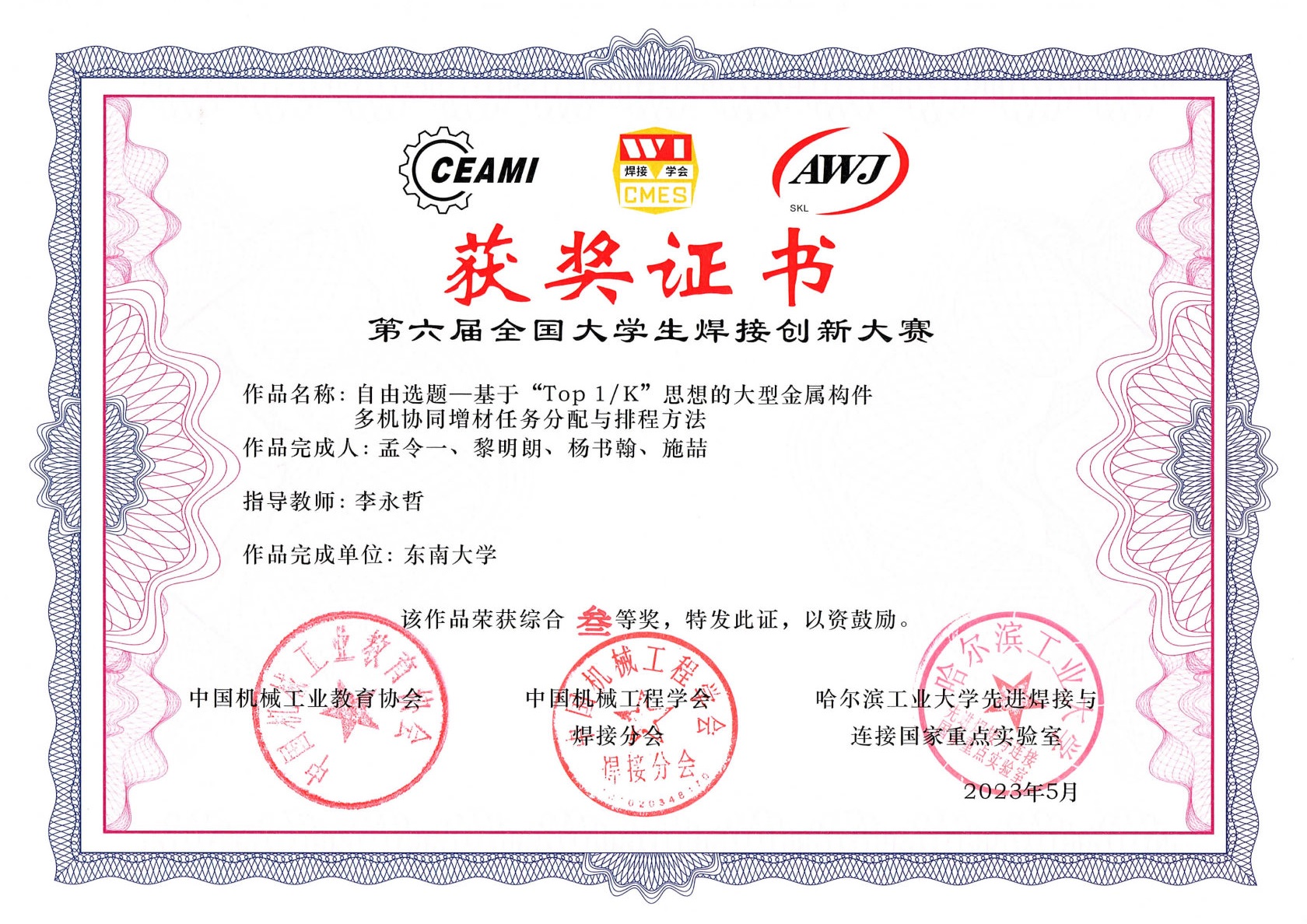 在学校教务处、彩金社区 的大力支持下,本届大赛东南大学代表队由刘小超副教授、李永哲副教授带队,刘小超副教授受邀担任自由命题组评委。经过紧张激烈的比赛,我校由张泰瑞、王青华老师指导,豆文欢、李超红、陆凯佳、钱睿4位同学完成的项目《基于超级双相不锈钢激光熔覆硬质合金层的船舶复合板制备》获固定命题一等奖;由刘小超老师指导,罗璟玥、万宇、包文辉、李瑞茹4位同学完成的项目《基于搅拌-涡流-机械互锁的复合摩擦焊界面的金属异质构件增材制造技术研究》获自由命题二等奖;由李永哲老师指导,孟令一、黎明朗、杨书翰、施喆4位同学完成的项目《基于“Top 1/K”思想的大型金属构件多机协同增材任务分配与排程方法》、由裴宪军老师指导,张龙怀、蔡路、王郑、杨宇轩4位同学完成的项目《抗屈曲纤焊复合结构设计》分别获得自由命题和固定命题三等奖。