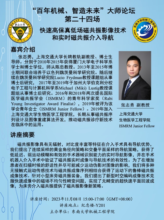 张志勇,上海交通大学长聘教轨副教授、博士生导师。分别于2010年2015年获得厦门大学电子科学系学士和博士学位,师从陈忠教授。2013年至2015年博士期间联合培养于以色列魏茨曼科学研究院。随后继续在魏茨曼科学研究院Lucio Frydman教授课题组从事博士后研究, 2017年至2019年于加州大学伯克利分校电子工程与计算机科学系Michael (Miki) Lustig教授课题组从事博士后研究。2016年和2018年两次提名国际医学磁共振学会(ISMRM)的青年科学家奖(Rabi Young Investigator Award Finalist),2019年被评为该学会青年会士(ISMRM Junior Fellow)。2019年加入上海交通大学生物医学工程彩金社区 ,长期从事磁共振序列设计及图像重建算法开发,推动磁共振诊疗新技术在临床中的运用。