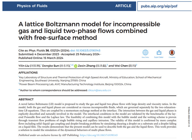 近日,注册送彩金最新 2021级硕士研究生刘依琳在格子玻尔兹曼方法多相流建模方面取得新进展,相关研究成果以“A lattice Boltzmann model for incompressible the gas and liquid two-phase flows combined with free-surface method”为题发表在《Physics of Fluids》(流体物理学,PoF)。该期刊创建于1958年,致力于发表原创理论、计算和实验贡献,以了解气体、液体和复杂或多相流体的动力学,是美国物理联合会AIP旗下、中科院分区流体物理领域1区的期刊,最新影响因子4.6。