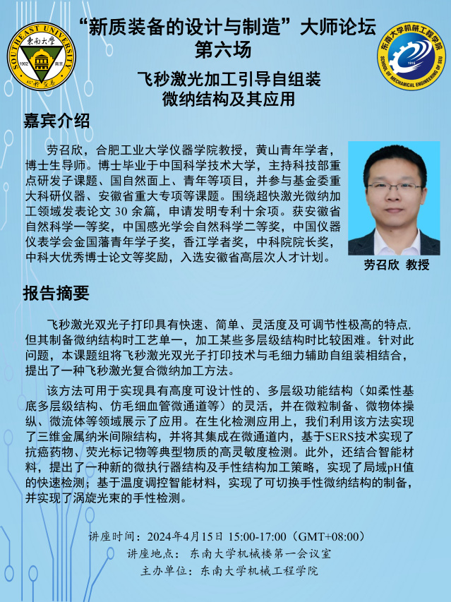 劳召欣, 合肥工业大学仪器彩金社区 教授, 黄山青年学者,博士生导师。 博士毕业于中国科学技术大学, 主持科技部重点研发子课题、 国自然面上、 青年等项目, 并参与基金委重大科研仪器、 安徽省重大专项等课题。 围绕超快激光微纳加工领域发表论文 30 余篇, 申请发明专利十余项。 获安徽省自然科学一等奖, 中国感光学会自然科学二等奖, 中国仪器仪表学会金国藩青年学子奖, 香江学者奖, 中科院院长奖,中科大优秀博士论文等奖励, 入选安徽省高层次人才计划。