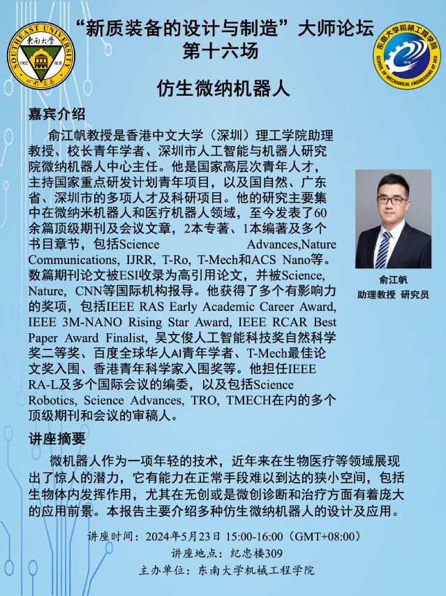 “新质装备的设计与制造”大师论坛 第十六场:俞江帆教授——仿生微纳机器人