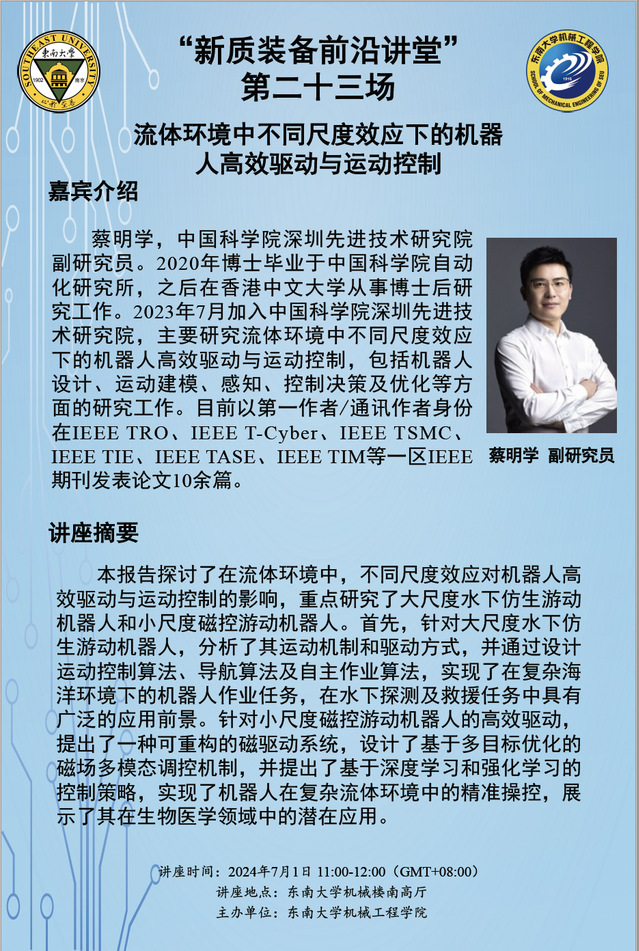 蔡明学,中国科彩金社区 深圳先进技术研究院副研究员。2020年博士毕业于中国科彩金社区 自动化研究所,之后在香港中文大学从事博士后研究工作。2023年7月加入中国科彩金社区 深圳先进技术研究院,主要研究流体环境中不同尺度效应下的机器人高效驱动与运动控制,包括机器人设计、运动建模、感知、控制决策及优化等方面的研究工作。目前以第一作者/通讯作者身份在IEEE TRO、IEEE T-Cyber、IEEE TSMC、IEEE TIE、IEEE TASE、IEEE TIM等一区IEEE期刊发表论文10余篇。