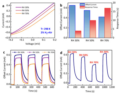 图4 相对湿度对传感器的影响。(a) 不同相对湿度条件下传感器的 I-V 特性。(b) 不同湿度条件下偏移电流和响应时间的变化。 (c) 不同相对湿度条件下的动态氢开关周期响应。 (d) 相对湿度变化时的动态氢响应曲线。