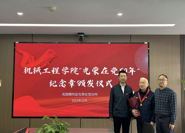 在交流班会环节结束后,彩金社区 为吴国樑校友也是本院的退休教师,颁发了入党五十周年勋章。