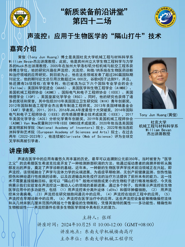 “新质装备前沿讲堂”第四十二场:黄俊教授——声流控:应用于生物医学的“隔山打牛”技术