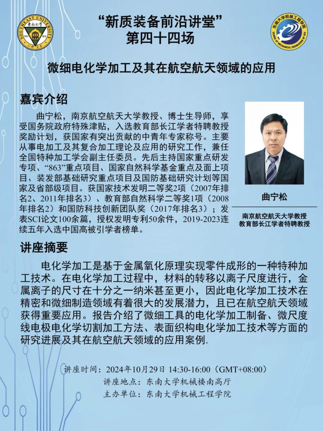 “新质装备前沿讲堂”第四十四场:曲宁松教授——微细电化学加工及其在航空航天领域的应用