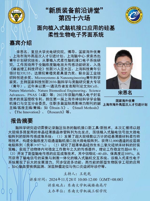 宋恩名,复旦大学光电研究院,博导。国家海外优青、上海市海外高层次人才引进计划、上海脑中心-求索杰出青年计划研究组长。从事植入式柔性脑机接口电子系统研究,工作围绕用于全脑维度脑电放大传感功能研发。入选《麻省理工科技评论》创新35人亚太区、上海科技青年引领计划35U35、达摩院青橙奖最具潜力奖、联合国工业组织科创进步奖、Microsystems & Nanoengineering青年科学家奖。主持国家科技创新2030-脑科学与类脑研究重大专项(青年)。近年来以第一/通讯作者发表期刊论文如Cell、Nature Materials、Nature Biomedical Engineering、Science Advances、PNAS(4篇)等;2022年获脑内植入电子封装技术的美国授权专利。担任第一届上海市神经科学学会脑机接口与交互分会委员,任职多篇国际高影响力期刊的副主编/客座主编/青编:如《Brain-X》、《Small Methods》、《The Innovation》、《Research》等。