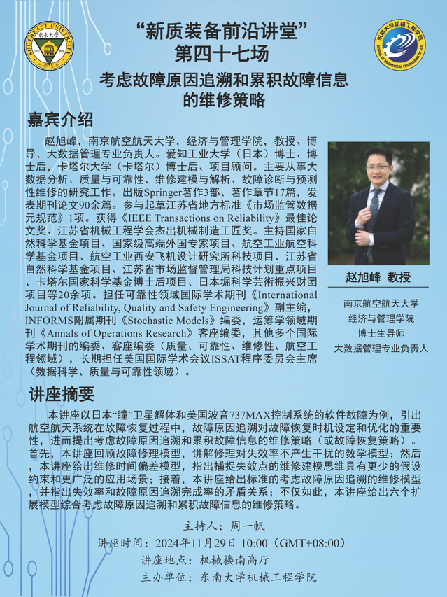 赵旭峰,南京航空航天大学,经济与管理彩金社区 ,教授、博导、大数据管理专业负责人。爱知工业大学(日本)博士、博士后,卡塔尔大学(卡塔尔)博士后、项目顾问。主要从事大数据分析、质量与可靠性、维修建模与解析、故障诊断与预测性维修的研究工作。出版Springer著作3部、著作章节17篇,发表期刊论文90余篇。参与起草江苏省地方标准《市场监管数据元规范》1项。获得《IEEE Transactions on Reliability》最佳论文奖、江苏省机械工程学会杰出机械制造工匠奖。主持国家自然科学基金项目、国家级高端外国专家项目、航空工业航空科学基金项目、航空工业西安飞机设计研究所科技项目、江苏省自然科学基金项目、江苏省市场监督管理局科技计划重点项目、卡塔尔国家科学基金博士后项目、日本堀科学芸術振兴财团项目等20余项。担任可靠性领域国际学术期刊《International Journal of Reliability, Quality and Safety Engineering》副主编,INFORMS附属期刊《Stochastic Models》编委,运筹学领域期刊《Annals of Operations Research》客座编委,其他多个国际学术期刊的编委、客座编委(质量、可靠性、维修性、航空工程领域),长期担任美国国际学术会议ISSAT程序委员会主席(数据科学、质量与可靠性领域)。