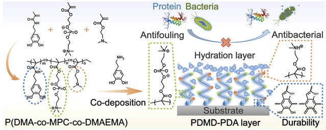 设计具备生物相容性、防污抗菌的多功能坚固保护涂层在减少植入式医疗器械的免疫排斥和感染方面发挥着重要作用。然而,开发这些保护涂层通常面临着一个悖论:能够通过自发沉积与底物实现稳定粘附的涂层材料不可避免地会持续吸生物污垢,而具有强水化能力以抵抗生物污垢附着的涂层材料对底物的粘附能力和耐久性有限。