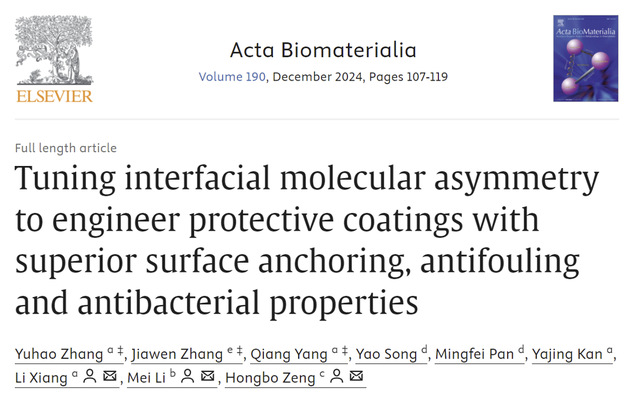 近日,注册送彩金最新 2023级硕士研究生张宇浩在生物材料期刊《Acta Biomaterialia》(中科院一区,IF=9.4)发表题为“Tuning Interfacial Molecular Asymmetry to Engineer Protective Coatings with Superior Surface Anchoring, Antifouling and Antibacterial Properties”的研究成果,设计了一种稳定防污抗菌的分子不对称结构涂层用于保护植入式生物医学设备。(论文链接://doi.org/10.1016/j.actbio.2024.10.015)