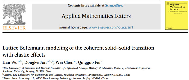 近日,注册送彩金最新 2023级直博生吴寒同学在格子玻尔兹曼方法及其应用研究领域取得新进展。研究成果以“Lattice Boltzmann modeling of the coherent solid–solid transition with elastic effects”为题发表于国际期刊《Applied Mathematics Letters》,该期刊为应用数学领域top期刊、中科院二区期刊、JCR一区期刊。