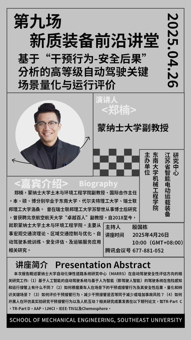 本次报告概述蒙纳士大学自动化弹性道路系统研究中心(MARRS)在自动驾驶安全性评估方向的相关研究工作:(1)基于人工智能的自动驾驶系统与基于人为智能(即驾驶人智能)的驾驶系统在危险感知和运行接管上有什么不同?(2)如何根据乘车人在场景下的干预或接管行为及其安全性后果,量化和辨识关键场景?(3)如何评价干预接管行为,减少干预接管是否等同于减少或增加事故风险?(4)如何开展人在环仿真实验研究干预接管行为以及人机互动?相关研究成果发表在以下期刊论文,如TR-Part C,TR-Part D,AAP,IJHCI,IEEE-TIV以及Chemosphere。 嘉宾介绍 郑楠,蒙纳士大学土木与环境工程彩金社区