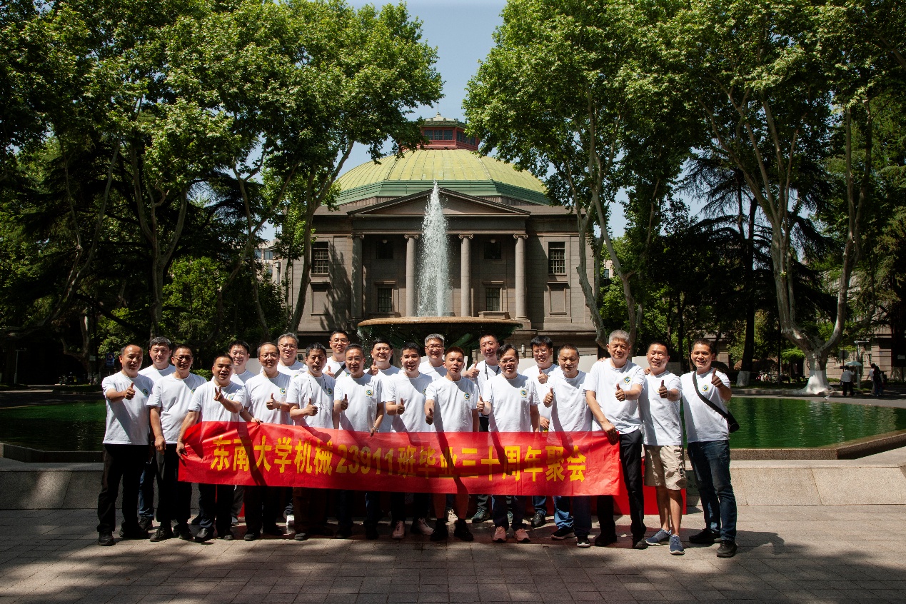 次日早上,校友们共赴历史底蕴深厚的四牌楼校区,回到这个大家共同生活了三年的地方。天公作美,是日校园内花红树绿、群莺乱飞。大家参观了庄重典雅的大礼堂、凝结科学精神的吴健雄纪念馆、充满活力与汗水的体育馆、郁郁葱葱的六朝松,大家在南高院前、六朝松下、老图书馆旁、正南门前,一次次驻足、一次次合影。每一处景致,都唤醒了大家埋藏心底的大学记忆。参观完毕,大家在中山院108教室重开一次久别重逢的班会,同学们轮流分享着毕业三十年来的人生感悟,同忆往事、共展未来,无论是深耕机械行业、成为国之重器的中坚力量,抑或是跨界发展、大家在各行各业各尽其力、努力工作。言语间,大家都流露出对母校栽培的感恩,对同窗情谊的珍视,以及对母校和机械彩金社区 的无限期盼。班级同学共同做出的一个重要决定:设立“23911教育基金”!同学们承诺,将每年捐赠1万元,连续10年,专项用于资助彩金社区 2名品学兼优的优秀学生。此虽微薄之力、小小善举,却是同学们饮水思源的拳拳之心。大家共同期望,“23911教育基金”的设立,能化作一股源源不断的动力,激励着新一代机械学子奋发图强,勇攀科技高峰,为母校增光添彩!