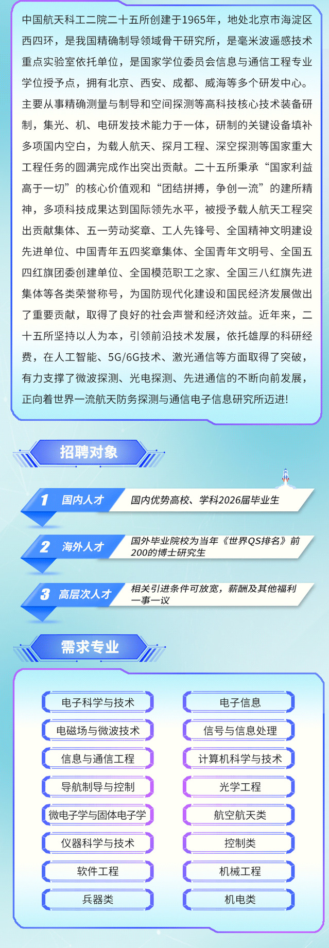 招聘 | 中国航天科工二院二十五所2026届毕业生秋季校园招聘开启