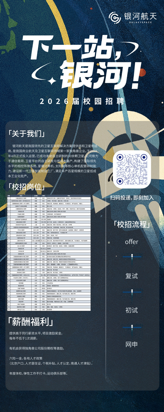 银河航天2026届校园招聘正式启动了!目前卫星研发、卫星智能制造、载荷研发、通信网络、供应链、质量技术、解决方案、信息化管理等岗位招聘中,岗位地点涉及江苏南通、北京、西安、成都、上海、无锡等地。