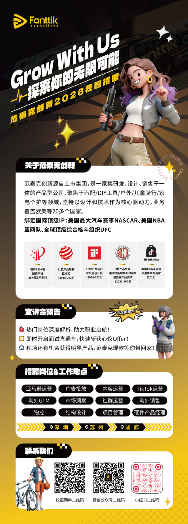 范泰克创新源于上市跨境公司傲基集团,是一家集研发、设计、销售于一体的产品型公司。傲基成立于2010年,员工超2000人,连续五年上榜“BrandZ™中国出海品牌50强”。 范泰克创新聚焦汽配/DIY工具/户外/儿童骑行/家电个护等领域,以“ 探索生活的无限可能 ”为理念,坚持以设计和技术作为核心驱动力。已建立线上线下一体化的全球化渠道矩阵,业务范围辐射至美国、欧洲等全球20多个国家和地区。目前公司员工超 400人,2022年至2024年,公司销售额连续三年稳步增长,2024年再创新高,同年成为北美区TikTok年度TOP30卖家。 公司总部设在深圳,并在苏州、成都、惠州等地设有办公地点,形成跨区域协同布局,持续整合设计、研发与供应链优势,推动产品创新与用户体验升级。