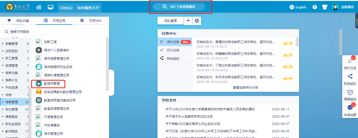 登录之后,系统主页面如图1-3-1所示,依次点击“可用应用→研究生院→培养管理→副导师管理”,或点击中上搜索框可以直接搜索需要使用的功能。