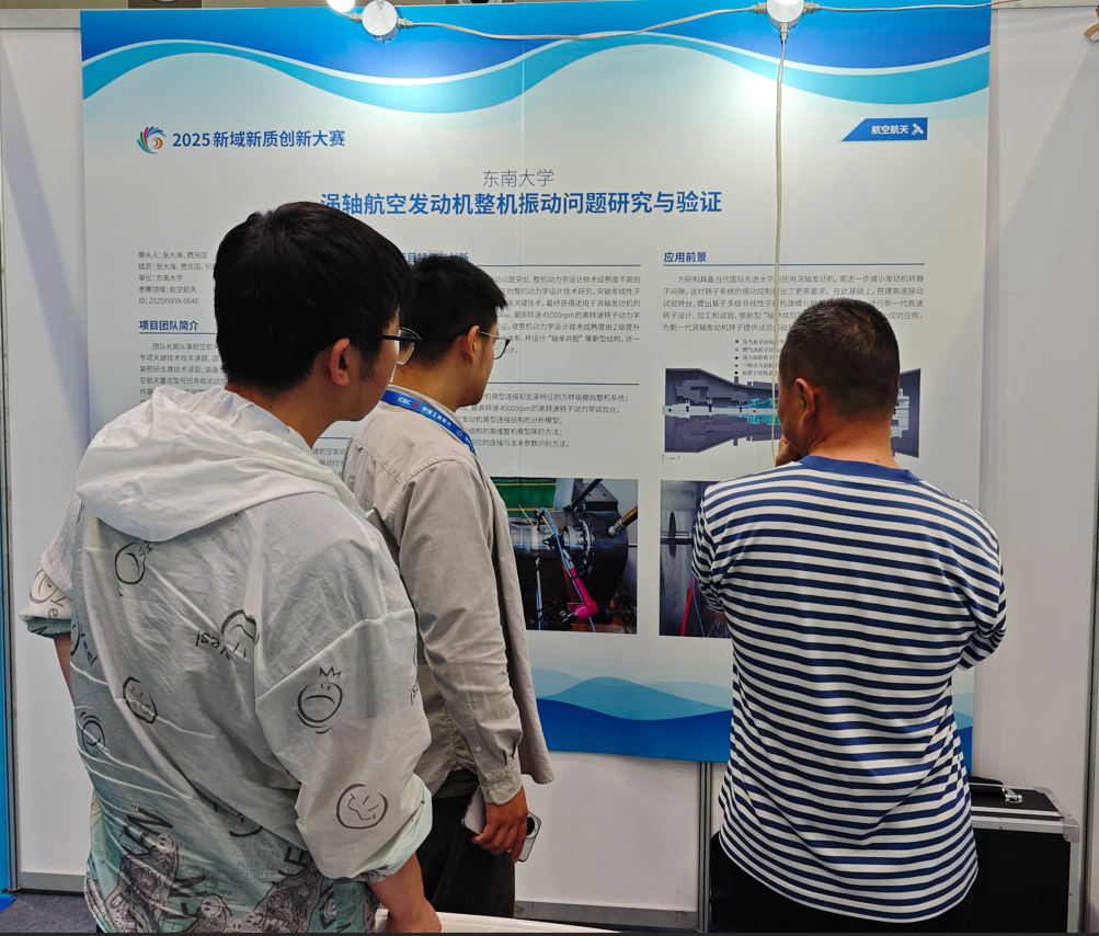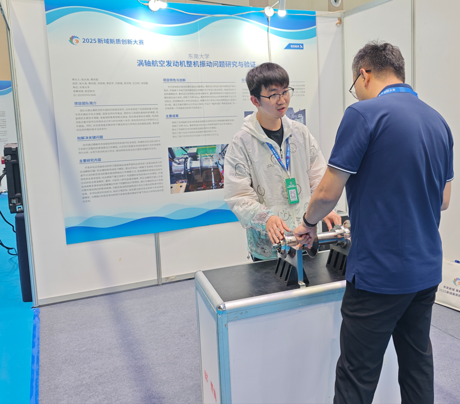 工业和信息化部主办的2025新域新质创新大赛决赛在青岛圆满收官。在学校研究生院和彩金社区 的指导下,彩金社区 何俊增、李宏宇、刘家璇、郝尤明、王文祥、余冠霆(指导教师:费庆国、张大海)组成的赛队“涡轴航空发动机整机振动问题研究与验证”项目,作为东南大学唯一进入全国总决赛的项目,历经全国预选赛、初赛和决赛的激烈角逐,最终获得优胜奖,充分展现了机械彩金社区 师生勇于挑战、创新不止的风采。
