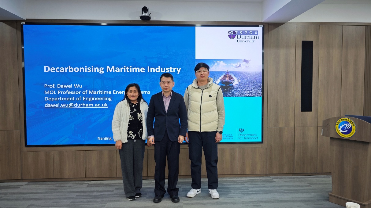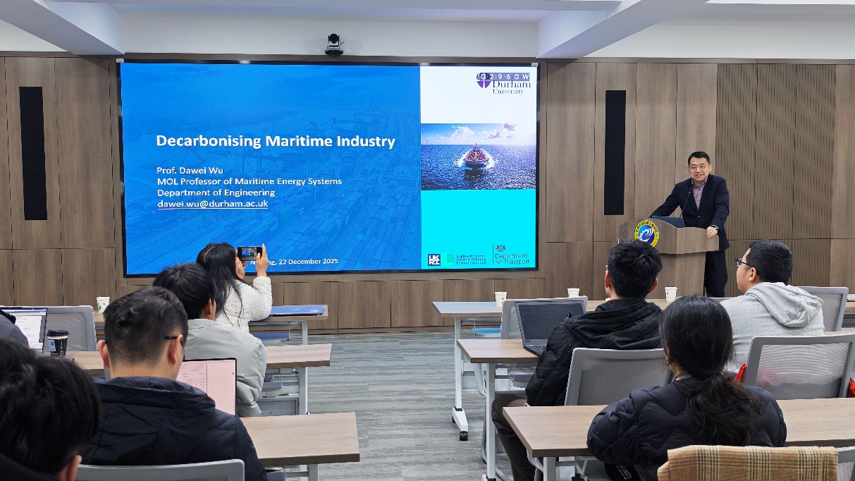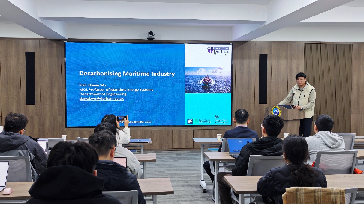 2025年12月22日下午,注册送彩金最新 特邀英国杜伦大学&Mitsui O.S.K. Lines (MOL)海事能源系统教授、英国清洁海事研究中心(UK MaRes)低碳动力与推进主题负责人Dawei Wu(吴大为)教授,开展题为“Application of Hydrogen and Alternative Fuel Powertrains for Vessels and Their Impacts on Maritime Decarbonisation”的讲座报告。Dawei Wu教授的研究重点在于氢气、氨气和合成燃料以及用于海事应用的低碳和零碳动力系统技术。通过将基础燃烧科学与工程实践相结合,他与工业界紧密合作,并领导多项旨在加速海事脱碳的英国及欧盟资助研究和示范项目。