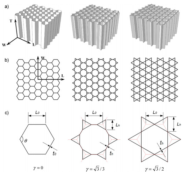 Fig. Configurations of the base hexagonal honeycomb (γ ¼ 0) and typical hierarchical honeycombs (γ ¼ ffiffiffi 3 p =3 andγ ¼ ffiffiffi 3 p =2): (a) 3D view; (b) top view; (c) single unit-cell.