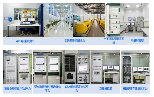 1.测功机台架5台,转矩测试范围(50-1400)Nm、转速测试范围(50-15000)rpm、满足并符合: GB/T 18488 -2015标准规范测试内容,测试项目:转矩-转速特性试验、效率试验、温升试验、反电动势试验、堵转转矩试验、超速试验、噪声试验、工作电压范围、最高工作转速试验、旋变初始角度、驱动电机定子绕组冷态直流电阻、控制精度试验、响应时间试验、可靠性试验等;2.变速箱台架19台,测试项目:变速箱档位自学习、单步调试、静态换挡、动态换挡、及各档位换挡耐久试验 ;3.机构测试台架18台主要测试机构耐久性能、考察选换挡各零部件的疲劳特性;4.总成测试台架4台,转矩范围(50-20000)Nm、转速范围(50-3500)rpm,测试项目换档性能测试、传动效率测试、噪音测试、动态密封测试、疲劳寿命测试、同步器寿命测试、换档性能测试、温升测试等;5.环境测试项目电机低温启动试验、电机高温工作试验、电机低温工作试验、电机湿热试验、防水防尘试验、盐雾试验、高温性能试验、低温性能试验、温湿度循环试验等满足并符合:GB/T 2423.22-2012 标准规范测试内容满足并符合:GB/T 2423.37;GB/T 4208;GB/T 4942.2标准规范测试内容。6.电磁兼容试验室,EMC试验测试项目:ESD静电放电测试 (非屏蔽室内)、BCI大电流注入抗扰度测试(屏蔽室内)、瞬态抗扰度测试(屏蔽室内);7.三综合振动试验台完成正弦振动、随机振动、机械冲击等试验。 8.静音房完成电机及总成的空载和加载噪音试验。