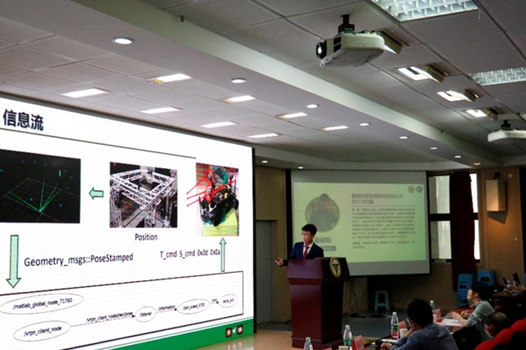 秦硕阳同学作了题为“智能网联车辆协同控制方法设计与仿真”的汇报,在汇报中,他首先介绍了智能网联车辆的相关概念,并且给出了一个早期的项目演示来具体展示测试情况。智能城市车辆内部位置和监控道路施工以及协调车辆控制的测试在不同的交通场景下,通过仿真可以模拟出不同情况下的匝道运行情况。将遥控车改造成 WiFi控制车,摄像头采集装置可以提供实时模型中车辆的精确位置,为基于交通场景的车辆精确控制提供了可能,结合精确位置和实时遥控,微智能城市可以提供一种综合智能车辆协同网络设计与仿真平台方法。点评交流环节,评委老师就无人驾驶目前的安全性和车辆控制、轨迹确定以及通信误差等问题进行点评交流。讨论交流环节,与会同学指出现有研究无法保证广阔的时域下保持跟车车况的问题,并就此展开具体讨论。