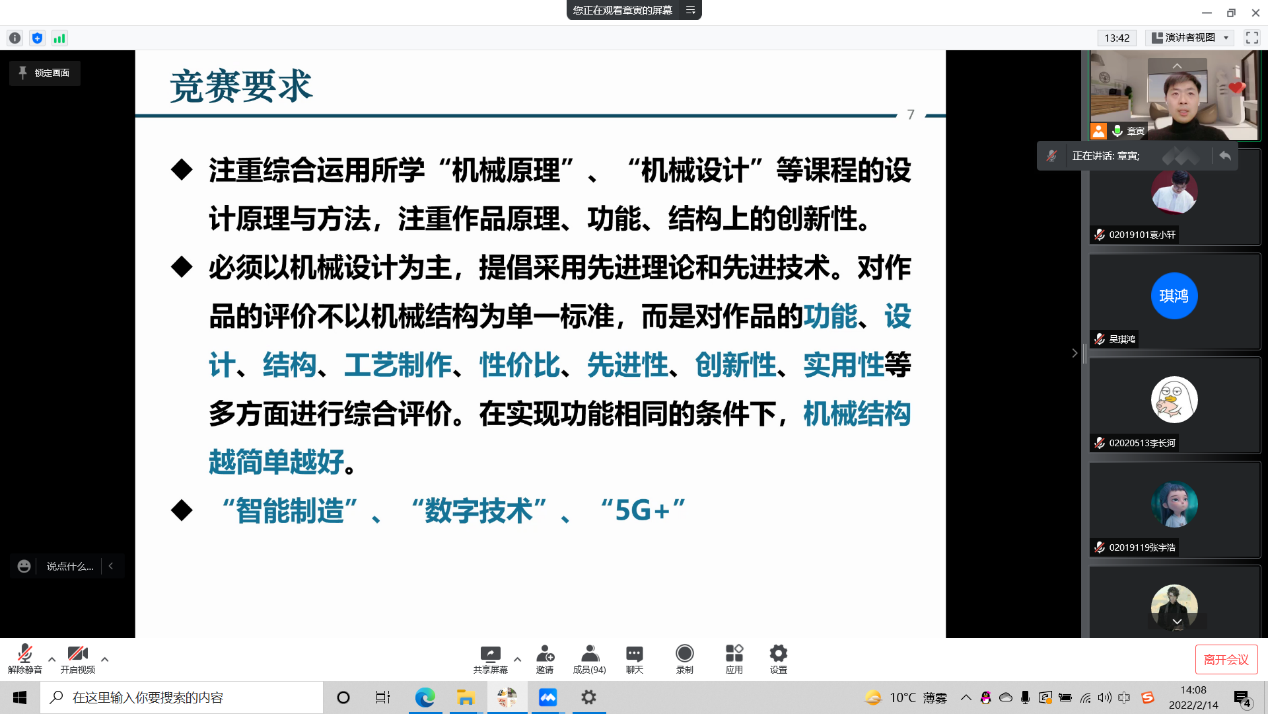 2月14日下午,由具有丰富竞赛指导经验的章寅老师、魏志勇老师和有参赛经验的季睿学长开展分享讲座,针对学生如何参加机械创新设计大赛进行培训。