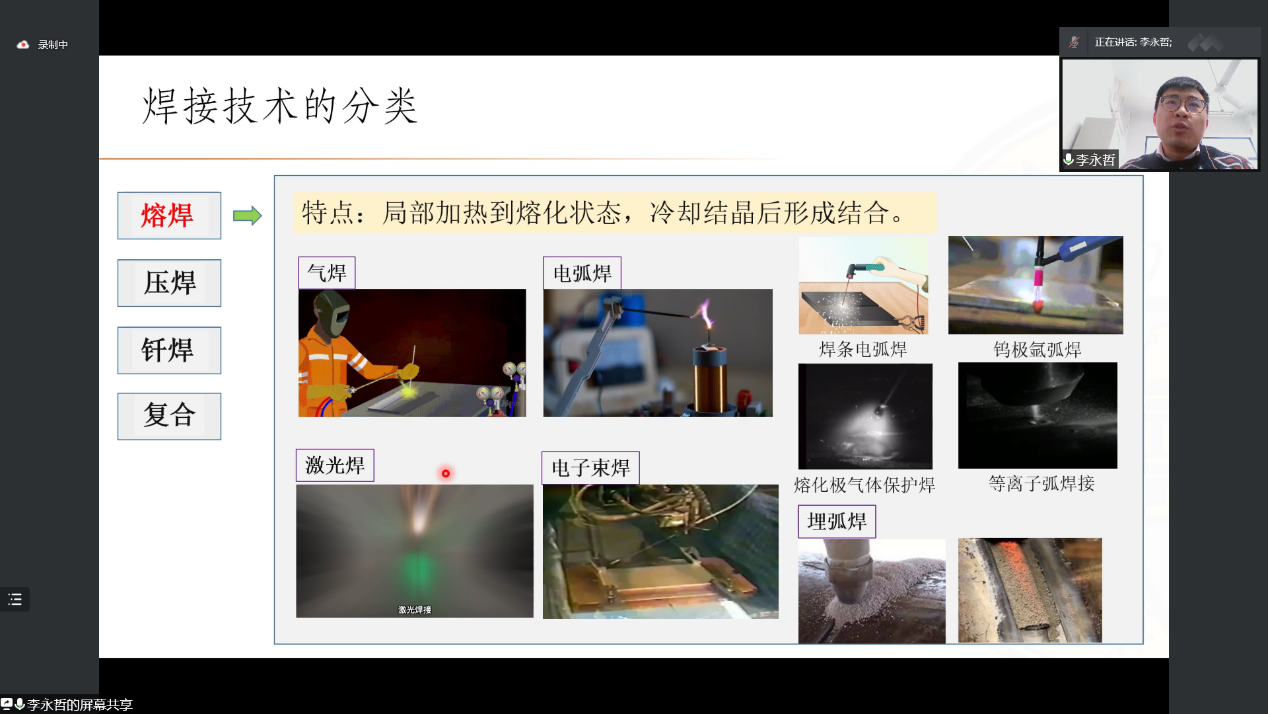 李永哲老师从焊接的定义、焊接技术的分类、先进焊接研究、焊接科学与技术、大赛题目介绍、比赛情况等方面,激发了同学们对焊接技术的兴趣,使同学们对焊接科学与技术有了初步的了解,并认识到焊接创新大赛的比赛形式与参加方式。
