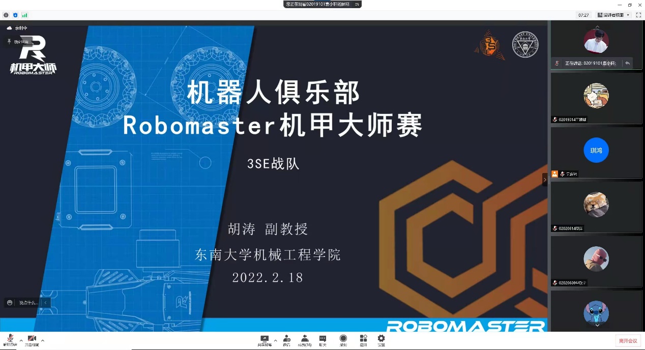 在2月18日下午开始的讲座上,机器人俱乐部的胡涛老师和成员们向同学们介绍了机器人俱乐部以及RoboMaster机甲大师赛。胡涛老师详细讲解了俱乐部的组成形式。机器人俱乐部划分为技术组和运营组两个大组,分别管理结构组,电控组,算法组,外联部,宣传部,财务部,组织部七个部门,共同完成机器人的制作任务并参加RoboMaster比赛。此外,胡涛老师还分享了机器人俱乐部已有的成果,包括社团成就、竞赛获奖和SRTP项目。