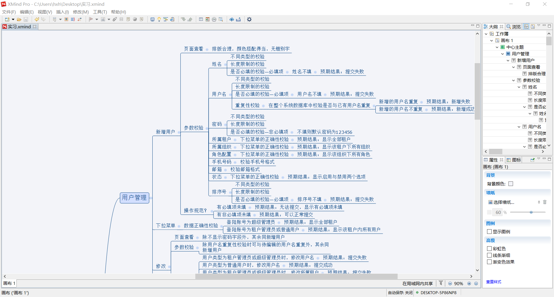测试用例编写。利用XMind软件进行测试用例的编写,将所要测试的功能具体操作和预期结果一一列出,包括页面、列表、新增、修改、审批等web操作测试,为后续测试提供条理性准备。