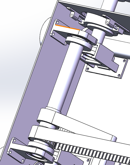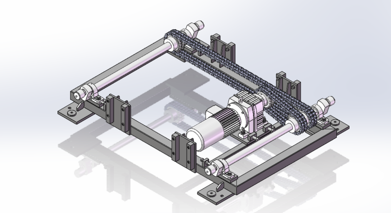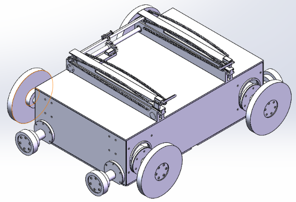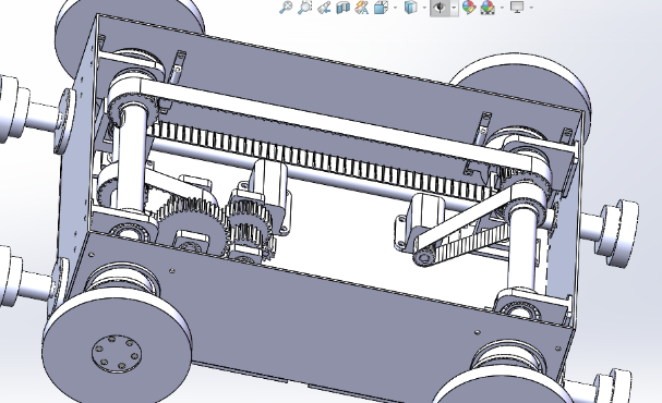 四向物流小车模型的建立。完成了小车中驱动轮系、货叉同步带结构、货叉叉板、货叉拉钩和小车框架的模型建立。