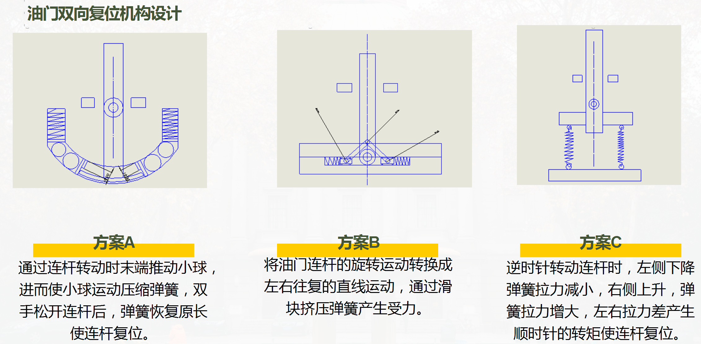 通过连杆左右摆动带动圆柱滚体在弹簧轨道左右运功,挤压弹簧产生受力用于复位。该机构的优点是原理简单,结构灵巧,不足之处是