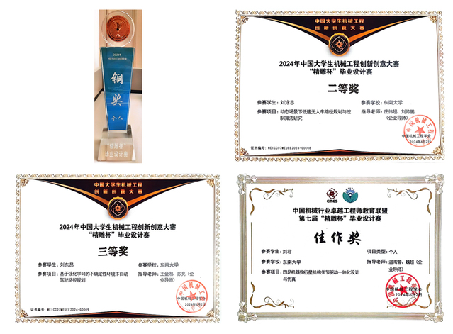 在决赛环节中,经过现场评委专家审阅、现场答辩和实物演示等多环节紧张激烈地角逐,注册送彩金最新 由庄伟超、刘帅鹏(企业导师)指导,刘泳志同学完成的毕设项目《动态场景下低速无人车路径规划与控制算法研究》获全国二等奖,全国个人铜奖;由王金湘、苏亮(企业导师)指导,刘东昂同学完成的毕设项目《基于强化学习的不确定性环境下自动驾驶路径规划》获全国三等奖、全国优胜奖;由温海营、魏超(企业导师)指导,刘君同学完成的毕业设计项目《四足机器狗行星机构关节驱动一体化设计与仿真》获全国三等奖,全国佳作奖。